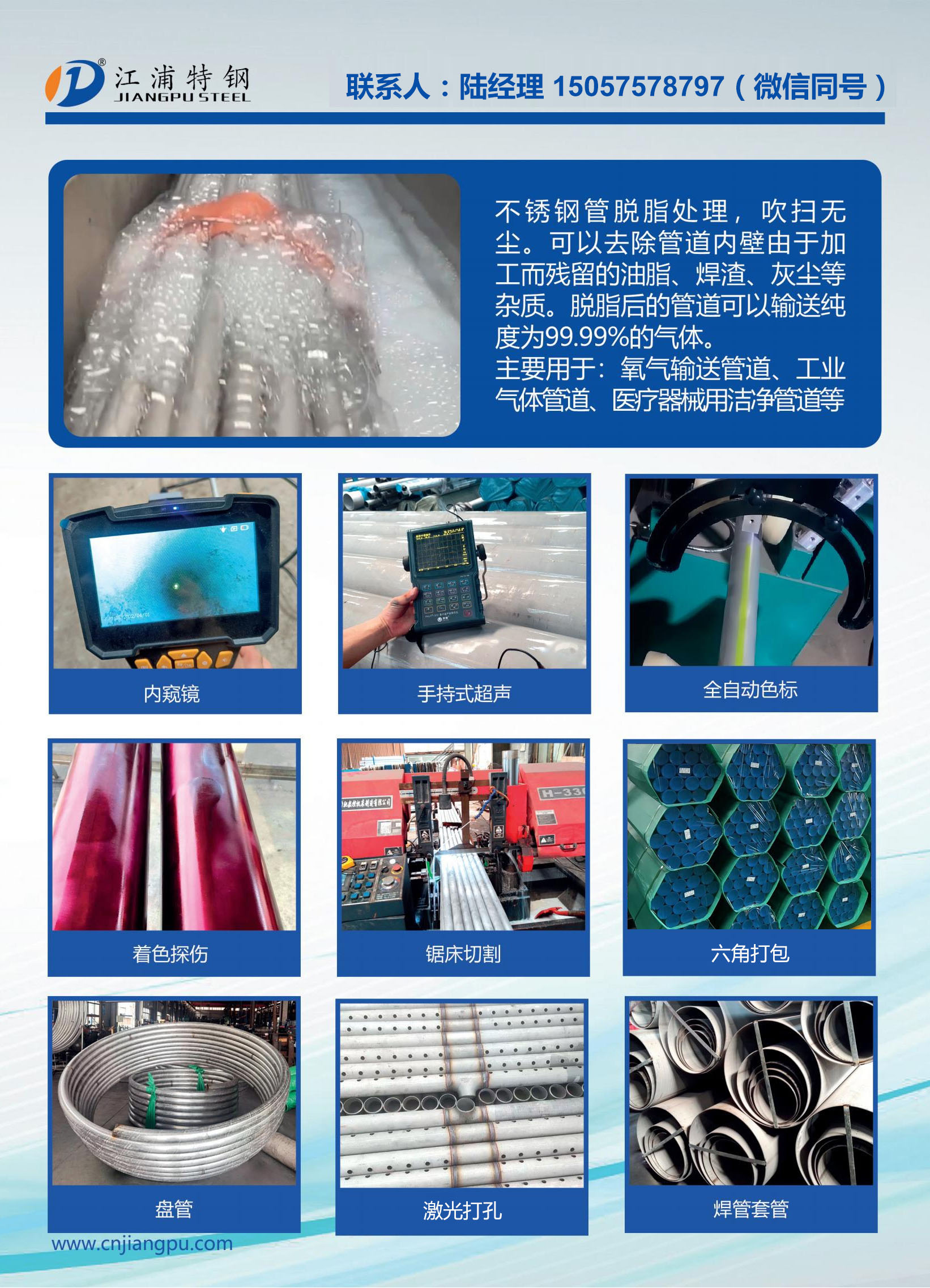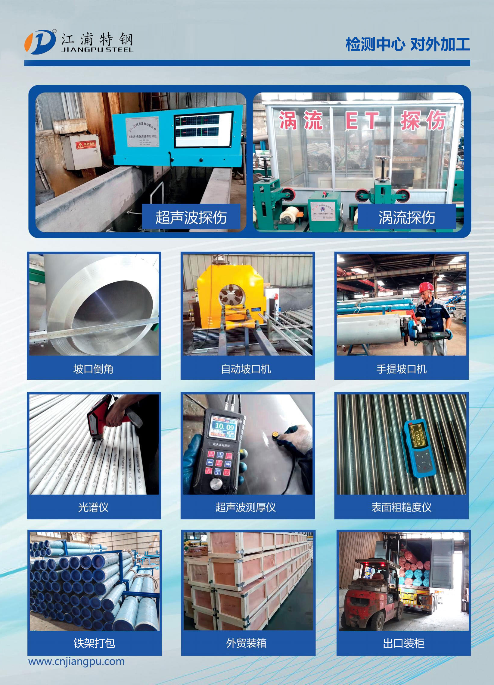 好消息!!! 江浦特鋼 檢測中心對外加工:脫脂,鈍化,渦流探傷,超聲波探傷,出口裝柜,精檢包裝。 |