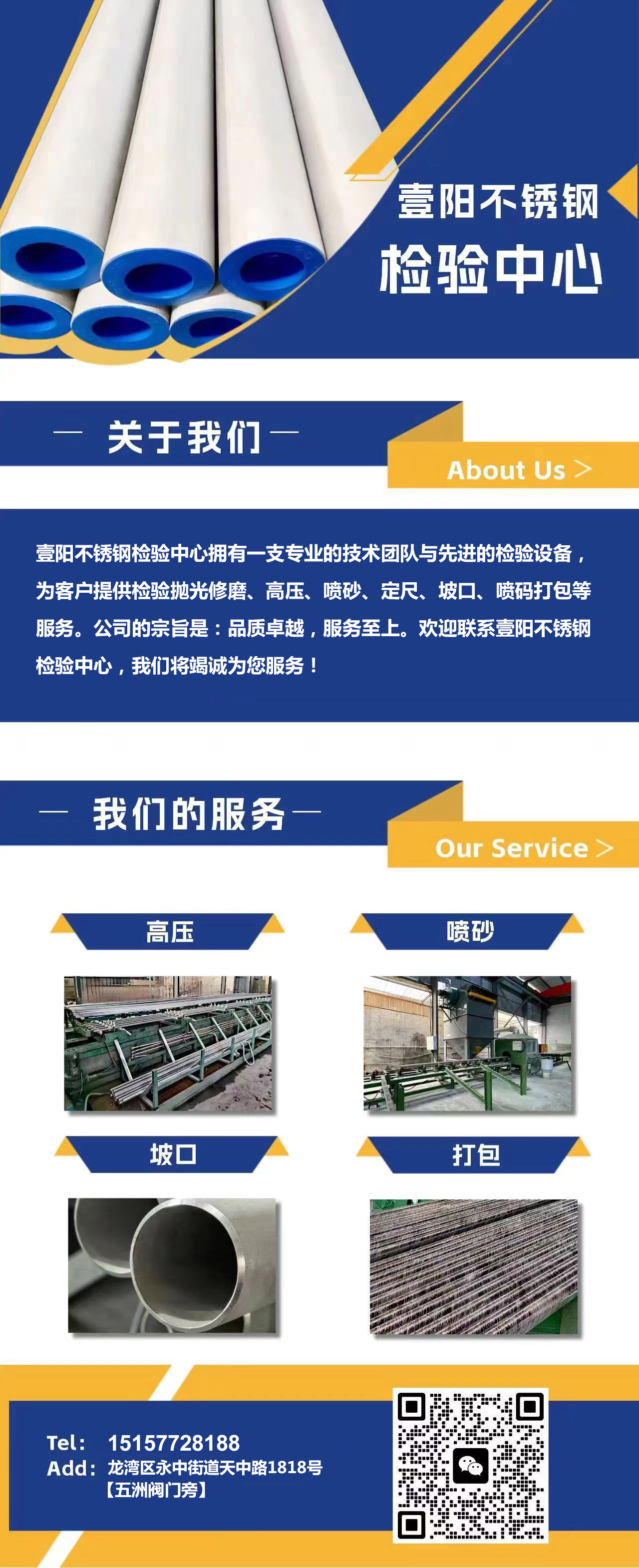 壹陽不銹鋼:檢驗中心對外加工:拋光、修磨、高壓、噴砂、定尺、坡口、噴碼打包。專線:15157728188