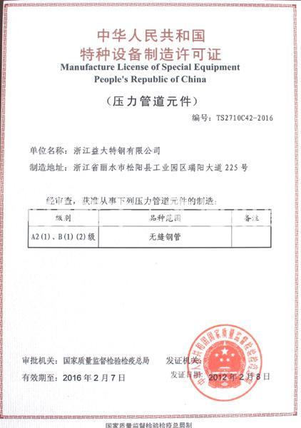 • 益大特鋼有限公司,特種設備許可證